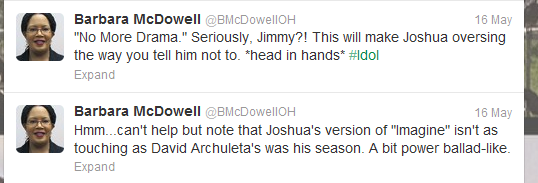 In terms of the Idol top three, I was floored by Jimmy Iovine’s failed choices for all the contestants as well as the judge’s selection that pushed Joshua to sing into the full-out stratosphere of too much. As I tweeted: